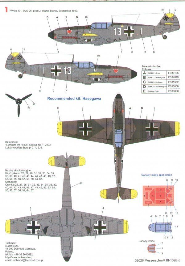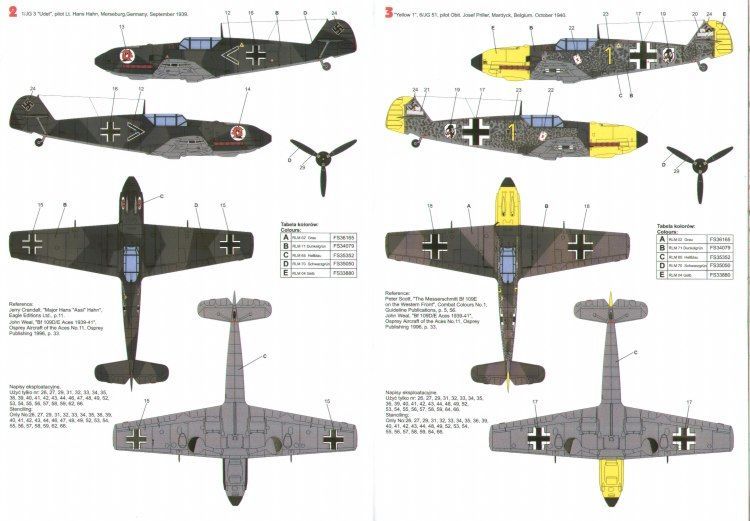 White 13 3/JG 26 Lt Walter Blume 1940 RLM 02/72/65; < 1/JG 3 Udet Lt Hans Hahn 1939 RLM 70/71/65; Yellow 1 6/JG 51 Josef Priller Belgium 1940 RLM 02/70/65 with yellow nose and rudder, inc canopy mask