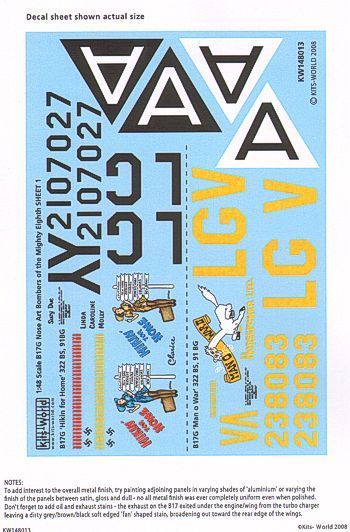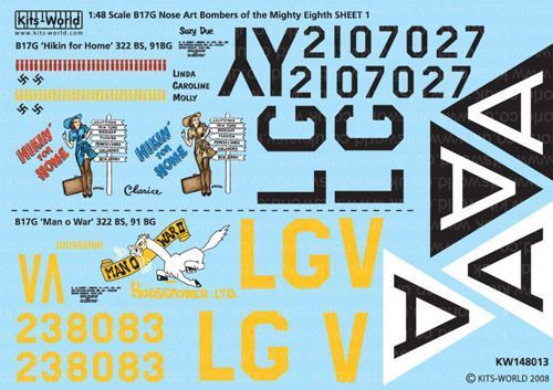 This kitsworld decal sheet includes schemes for 2 Boeing B17f aircraft of the USAAF Eighth Air Force: This sheet includes 2 B17G nose art designs 'Hikin for Home' -'Man o War Horsepower'.