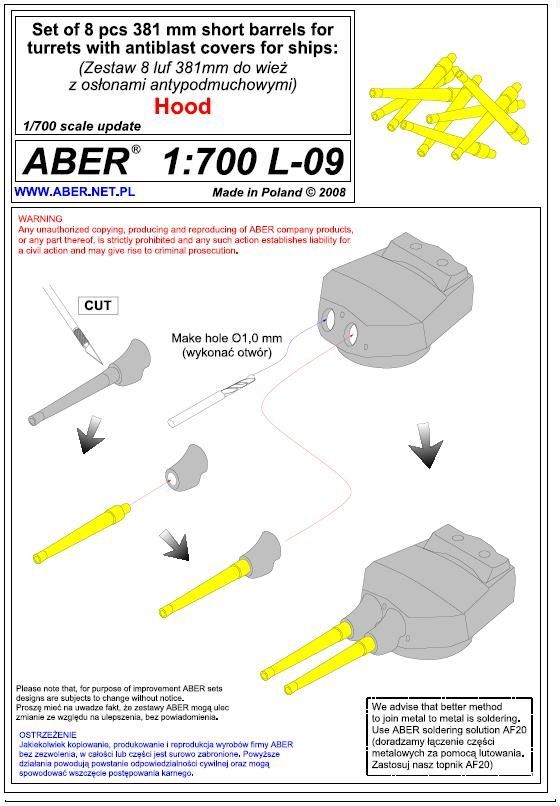 1:700 Set of 8 pcs 381mm short barrels for turrets with antiblast covers ships Hood