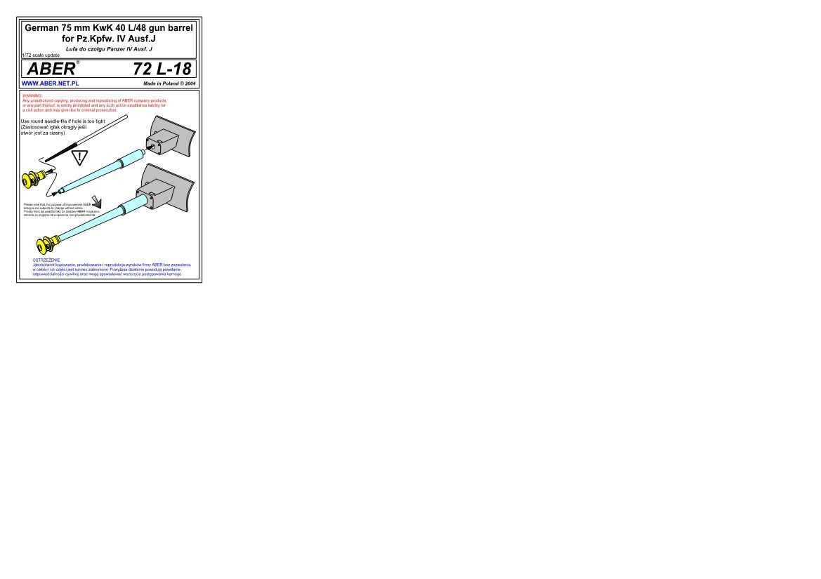 1:72 German 75mm KwK 40 L/48 gun barrel for Pz.Kpfw. IV Ausf.J