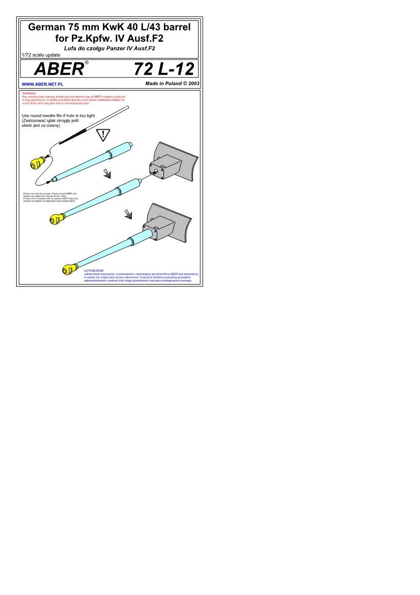 1:72 German tank barrel 75mm KwK 40 L/43 for Pz.Kpfw. IV Ausf. F2