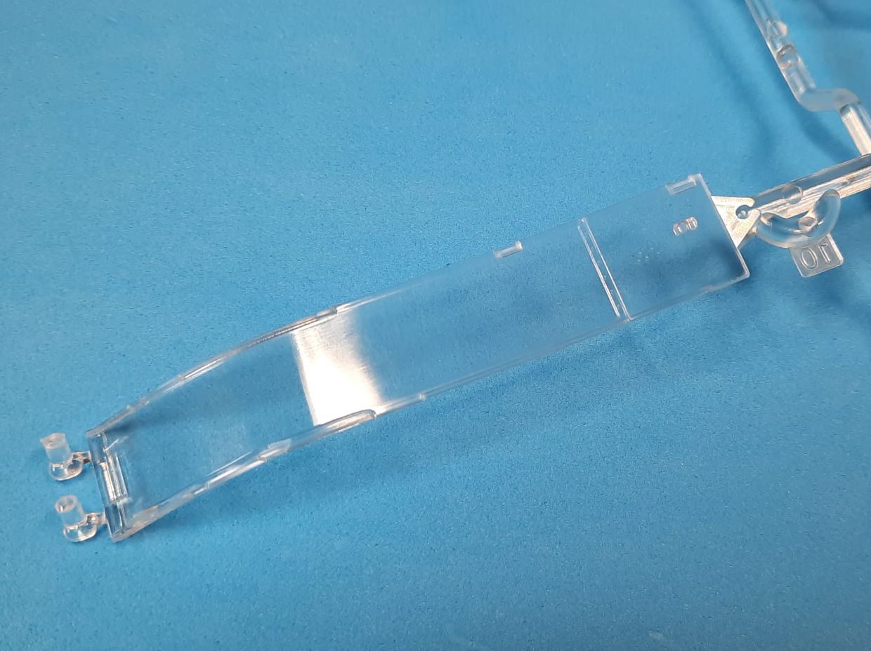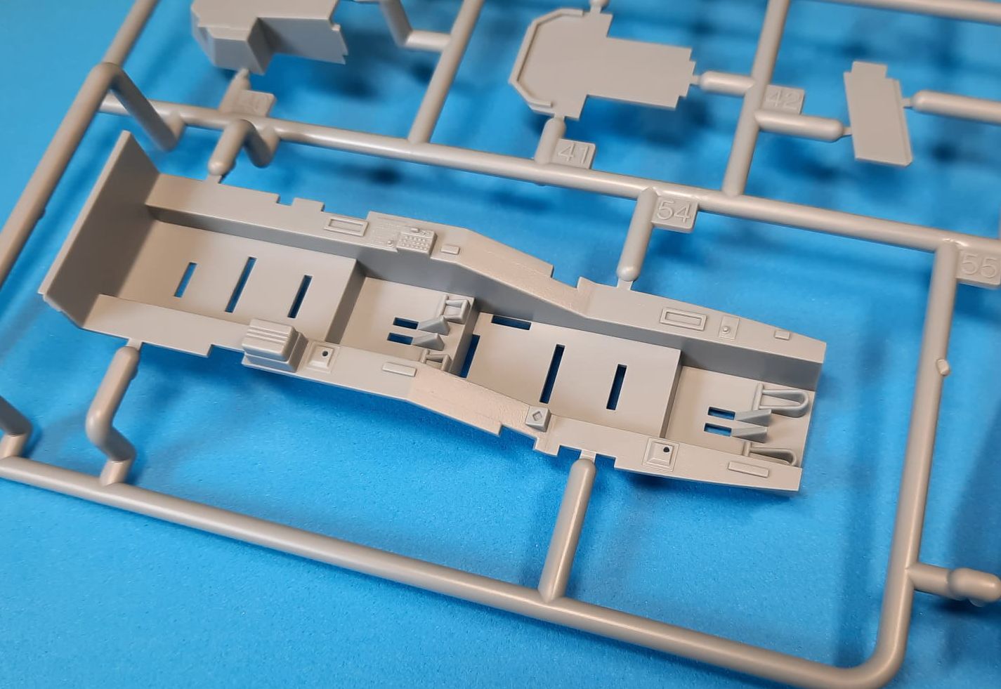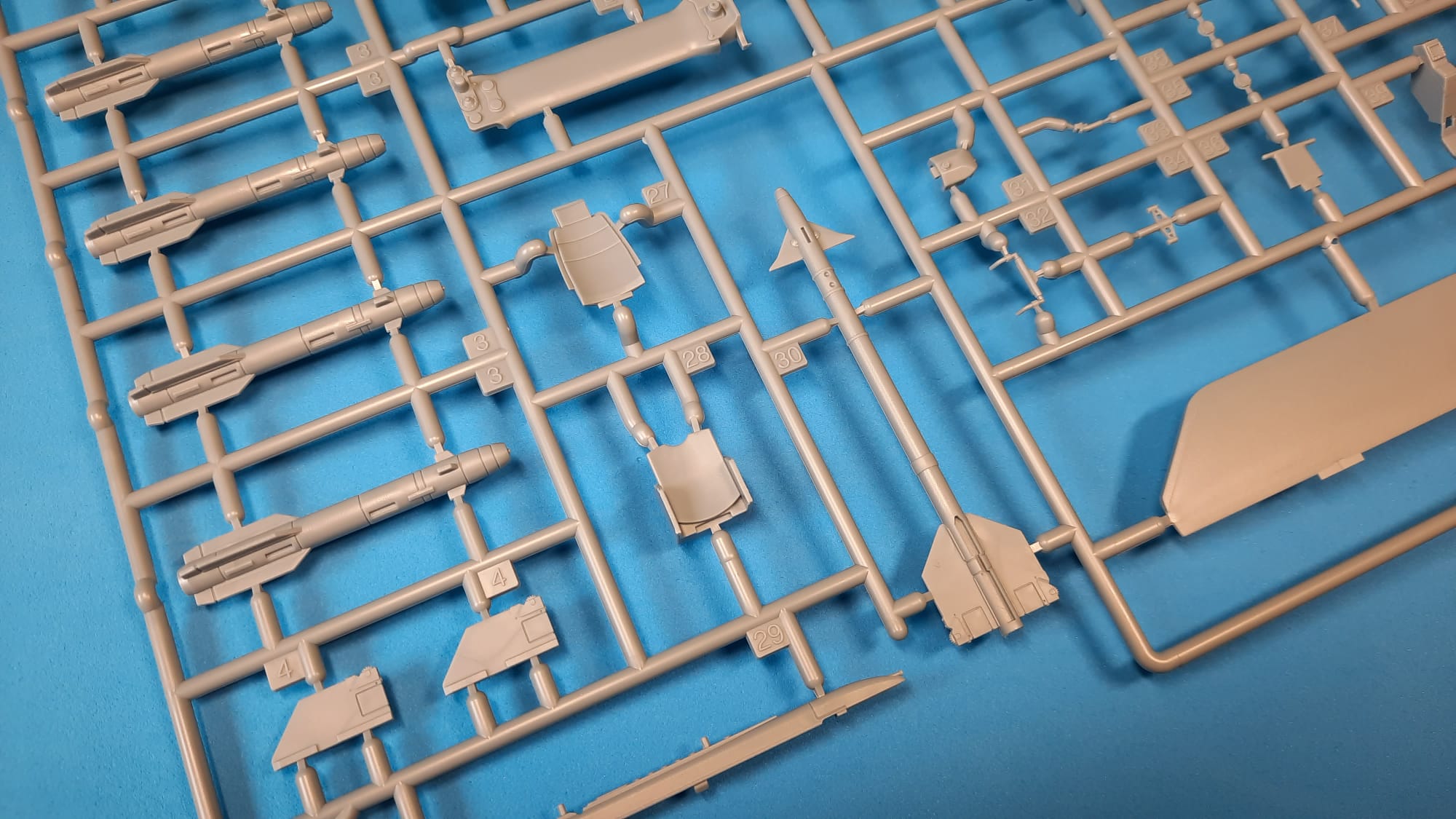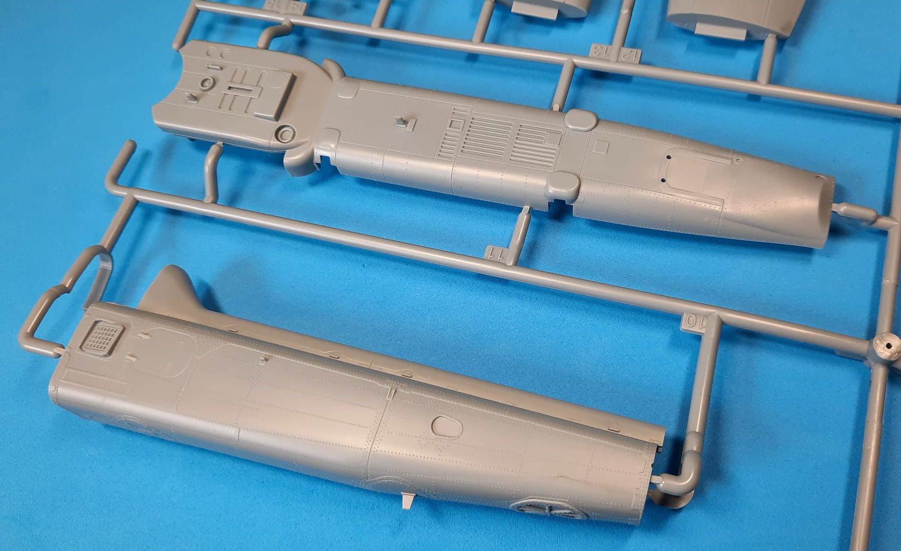 The moldings are beautiful with no sinkholes or plucks. The surface is littered with tiny positive rivets, the panelling lines are negative. The Academy also used multi-part moulds for some of the pieces. This, on the one hand, saves time and worries about fitting, on the other hand it will be necessary to remove the dividing line in the contact of the moulds, which, especially in places between rivets, will not be entirely straightforward. This applies especially to the tail girder. The surface is furnished with nice protruding details, various grids, some of which we add from etched planchette. The cockpit is slightly simpler, it will be convenient for fawns to replace the seats and dashboards, the seats in the kit are belt-free, the overlay can also be left in the open position. We can use the enclosed white vinyl foil masks for the clear parts. The rotors are also nice from the kit, we can add different wires to their mechanism. We will also find quite a lot of weaponry in the mouldings, but it will be good to stick to photographs of real machines and not blindly hang everything available.